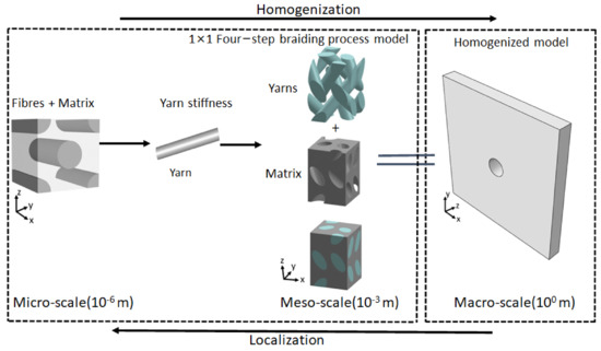 The braided anisotropic plate with a center hole is modeled for investigation. Due to heterogeneity, three-scale modeling is performed, namely micro, meso, and macro, as shown in Figure 1. At the micro and meso levels, homogenization is performed to calculate mechanical stiffness for the macro plate in order to analyze it in Section 2.2.