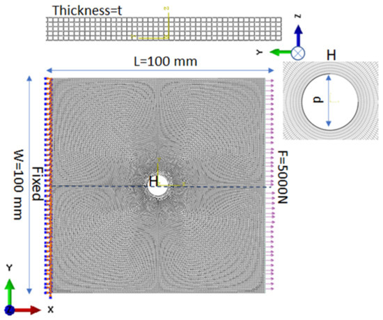 Finally, the macroscale homogenized plate is modeled. The macro plate properties are obtained by the combination of micro- and mesoscale analysis, so in the properties transfer process, it is considered that there is no information loss during coordinate transfer. The plate section is assigned by the calculated homogenized mechanical properties. The plate is subjected to a unidirectional tensile load of 5000 N with fixed support at the second end, as shown in Figure 3. The geometry and load are varied to collect various data for stress and SCF calculation.