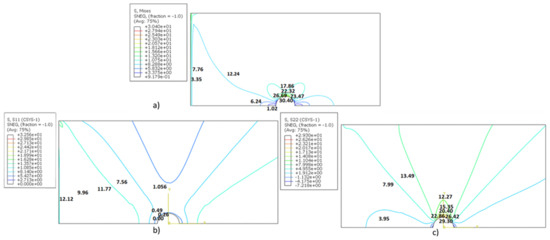 (a) Von Mises stress, (b) Radial stress, (c) Circumferential stress for the isotropic plate under uniform tension.