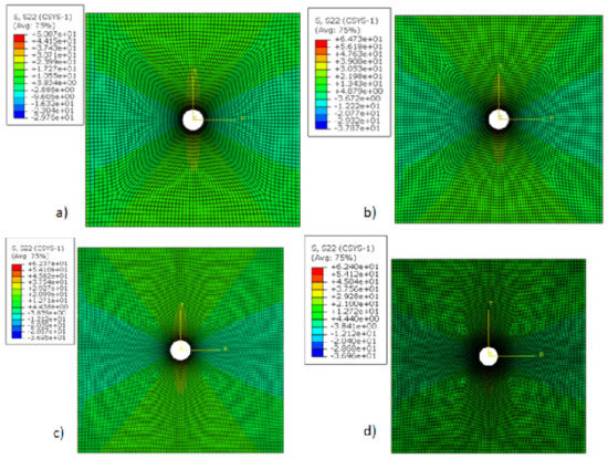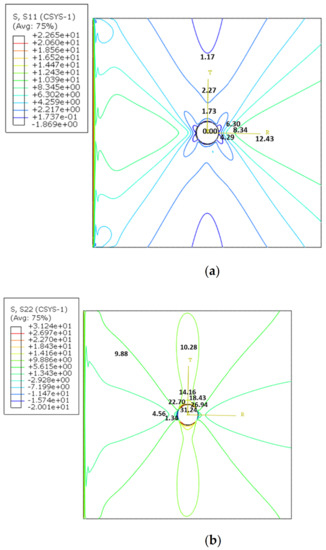The theoretical calculation of stress distribution around a circular hole is performed based on Equations (19)–(21) for radial (, circumferential (, and radial–circumferential ( directions in a plate under uniaxial tension.