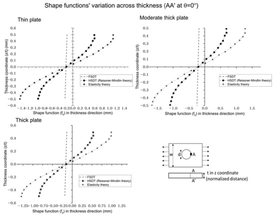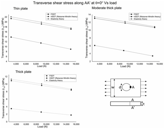 Maximum transverse shear stress, calculated by FSDT, is 37, 56, and 70 percent less than HSDT and elasticity theory for thin, moderate thick, and thick plates, respectively. The results show that transverse stress depends on the analysis theories for variable thickness. It indicates that HSDT predicts similar results to the elasticity theory, as elasticity theory is the generalized 3D theory, so HSDT (Reissner–Mindlin) can predict accurate transverse shear stress variation, but FSDT is significantly different from the elasticity theory, so it cannot be considered for accurate transverse shear stress distribution. When the plate’s aspect ratio (L/t) is increased, the results’ difference of FSDT from HSDT and elasticity theory is increased. In addition, even transverse stress is significantly lower for thin plates, but HSDT is needed for accurate calculation because, although the plate is thin, the results’ difference is 35 percent, which is significantly high. It can also be seen in the transverse shear stress versus the load graph in Figure 8, which shows the variation of transverse stress with a change in load. The plot’s consideration point (across thickness A-A’) is at zero angle along the loading direction. The results indicate that when the load is increased, the transverse shear stress decreases; also, the decrease slope is the same for the analysis theories, but FSDT values are significantly lower than HSDT and the elasticity theory. Figure 9 shows the shape function with the normalized thickness coordinates at the center hole radius section; it indicates the sensitivity of calculations of analytical theories. It is foundthat the shape function of FSDT is a tilted linear line across the thickness, and HSDT curve behavior is the same as elasticity when calculating the behavior along with thickness for a braided polymer plate. The trend of the obtained results is verified by the existing literature. The transverse shear stress to load is checked to ensure that the trend of current results is the same as in the literature [31]. As the analysis findings for a polymer braided plate with center hole are conducted for the first time, only the analysis process and results trends are verified.
