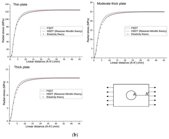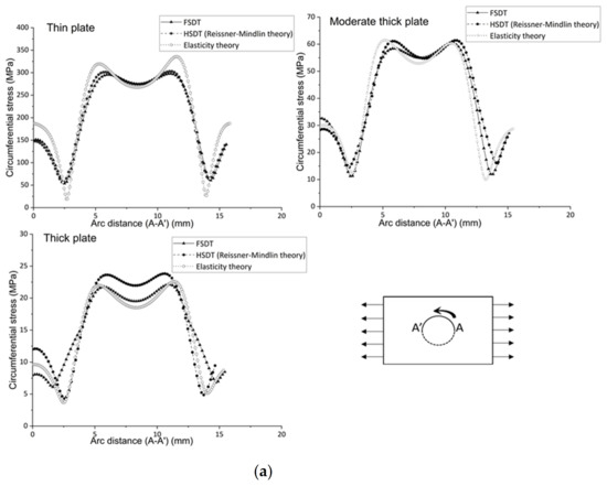 It can be seen that hoop stress leads to higher stress slightly away from the middle of the hole radius in the braided plate due to its directional material behavior. The radial and circumferential stresses’ contour shows the stress variation around the plate hole. The hoop stress is oriented on the hole radius, but the concentration point is not exactly in the middle of the hole radius; the variation of the curve is like the top (at the left side point A’), down (middle point), and top (right side point A) around the hole radius, as shown in Figure 10. The radial stress varies from zero to maximum from the hole radius to the edge point. First, the values increase linearly and then curve and are finally constant until the edge. All theories have a similar trend for each thickness to calculate the radial stress. In addition, FSDT and HSDT are as accurate as the elasticity theory; the error difference is only 1.6 percent for each thickness aspect. For circumferential stress, FSDT and HSDT obtain the same results as the elasticity theory for thin and moderately thick plates, but for thick plates, FSDT and HSDT obtain 1.5 and 0.4 percent errors, respectively, compared to the elasticity theory, which is minimal. So, to calculate the radial and circumferential stress, it is good practice to choose FSDT because of less computation and modeling time. Thus, if there is consideration other than transverse shear stress (such as circumferential, radial stresses, and other plane stresses in primary consideration), then FSDT can be considered to save time and cost, but consideration of the transverse shear stress HSDT is needed.