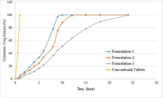 The values of the dissimilarity factor were above 50 for all the dissolution profiles, indicating their significant difference. The highest value of f1 was observed in the comparison of conventional tablets and Formulation-3, indicating that HPMC significantly modified the dissolution rate. Similarly, the values of the similarity factor were very low, as shown in Table 6. All the dissolution profiles were different from each other and showed no similarity.