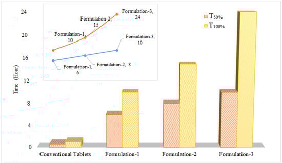 In addition to the mentioned parameters, time taken by each formulation to release 50% (T50%) and 100% (T100%) of the drug was also determined. Similarly, the quantity of drug released at different time points was also compared.