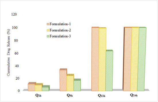 Similarly, an increase in the concentration of HPMC reduced the drug release at different time points, as shown in Figure 5.