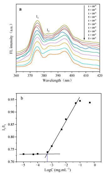 The micelle formation by PMA-MPEG1.4 was verified by the fluorescence spectra using pyrene as the probe [36]. Figure 1a presents the emission spectra of pyrene in the presence of PMA-MPEG1.4. The intensity of the I1 peak gradually decreases with the incorporation of pyrene into the hydrophobic core region of the micelles from water, and the intensity ratio I3/I1 indicates the variation in micelle concentration. Figure 1b shows the intensity ratio of I3/I1 in the pyrene excitation spectra as a function of the logarithm of PMA-MPEG1.4 derivative concentration. The intersection of the two tangent curves, a horizontal curve at low derivative concentrations and the inflection, was determined to be the CMC; and the CMC value was 4.63 × 10−4 mg/mL. This value implied that the derivative had a very strong tendency to form micelles in aqueous solution.