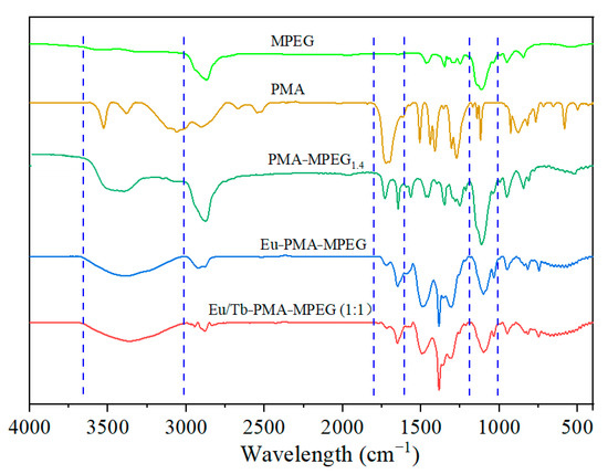 FT IR spectra of MPEG, PMA, PMA-MPEG1.4, Eu-PMA-MPEG and Eu/Tb-PMA-MPEG (Eu/Tb = 1:1).