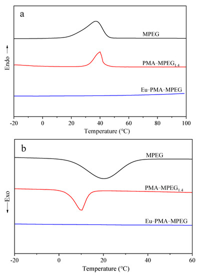 PEG is a typical semi-crystalline polymer. Here, MPEG with a low molecular weight (Mn = 1000) was used to improve the hydrophilicity of the insoluble PMA molecules and as-prepared nano-assemblies with Ln ions. DSC was employed to investigate the melting and crystallization behaviors of MPEG chains when introduced into PMA and Ln-PMA assemblies. Figure 3 depicts the second heating curves (a) and cooling curves (b) of MPEG, PMA-MPEG1.4 and Eu-PMA-MPEG. As seen from Figure 3a,b, the endothermal peak and the exothermal peak of the PMA-MPEG1.4 appeared at a relatively higher temperature (about 40 °C) and lower temperature (about 10 °C), respectively, compared with that of pure MPEG. The hydrogen bond interactions of unreacted carboxyl groups in PMA component were responsible for the acceleration of the crystallization process of MPEG moieties and the increased melting point of MPEG moieties. However, when the carboxyl groups of PMA-MPEG1.4 coordinated with Eu3+ ions, both the melting and crystallization behaviors of the MPEG component were destroyed, implying that the formation of Eu-PMA structure completely restricted the crystallization process of MPEG moieties to produce an amorphous state, which was consistent with previously reported results that the addition of nanoparticles caused a further reduction in the crystallinity of PEG [38]. It was also found that the Eu/Tb-PMA-MPEG sample was the same as Eu-PMA-MPEG, displaying a transparent and viscous fluid state at room temperature due to the amorphous structure of the MPEG component.