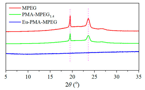 Further, the crystallinity of MPEG, PMA-MPEG1.4 and Eu-PMA-MPEG were investigated by XRD (Figure 4). As seen from Figure 4, pure MPEG displays the two main characteristic peaks at 19.1° and 23.2°, and the two characteristic peaks of MPEG moieties slightly become weaker after the reaction with PMA to produce PMA-MPEG1.4. However, for Eu-PMA-MPEG, neither crystal characteristics of MPEG moieties nor Eu-PMA assemblies could be observed, indicating that the semi-crystalline structure of MPEG moieties was completely disturbed after coordination with Eu3+ ions. The results are consistent with the DSC results (Figure 3a,b); the MPEG moieties in the Eu-PMA-MPEG exhibit an amorphous state without melting and crystallization behaviors. The viscous MPEG chains encapsulate the Eu-PMA nano-assemblies and may hinder the appearance of their crystalline characteristics.