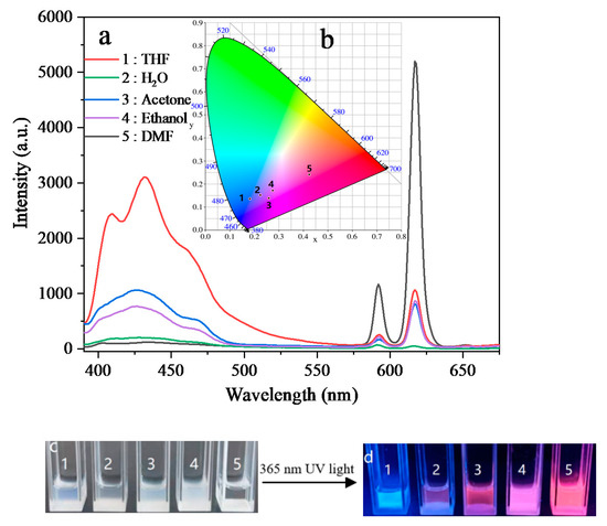 Eu-PMA-MPEG was readily dispersed into different solvents. The fluorescent properties of Eu-PMA-MPEG were investigated in different solvents. Figure 6a presents the fluorescence spectra of Eu-PMA-MPEG at a concentration of 5 wt% in THF, H2O, acetone, ethanol and DMF investigated using a 360 nm excitation wavelength. As seen from Figure 6a, the peak at 390–480 nm is the emission of the ligand PMA-MPEG1.4. The peaks at 592 nm, 617 nm and 652 nm are the emission peaks of the Eu ions with the 5D0→7FJ (J = 1,2 and 3) transitions, respectively, and the peak at 617 nm is very intense, which is the typical red luminescence observed in Eu3+. Their fluorescence intensities change significantly in different solvents. The fluorescence intensity of Eu-PMA-MPEG is strongest in DMF, and then in THF, ethanol, acetone and water in sequence. There are several reasons for these variations. First, the solubility of Eu-PMA-MPEG in various solvents is different due to the various polarities (Figure 6c). Eu-PMA-MPEG is easily dispersed in DMF and the solution is nearly transparent; the aqueous solution of Eu-PMA-MPEG is slightly turbid; the solutions become increasingly turbid from THF, to ethanol and acetone, indicating that the Eu-PMA-MPEG particles have a tendency to aggregate in these solvents, and that the agglomeration of Eu-PMA-MPEG in these solvents could result in fluorescence quenching. At the same time, in these systems, energy transfer occurs between the PMA-MPEG1.4 ligand and Eu3+ ions, which is more complex than when small molecules are used as organic links; as seen from Figure 6a, the fluorescence intensities of PMA-MPEG1.4 obviously varied in different solvents. It is also possible that solvent molecules favor the formation of Eu-PMA complexes with large coordination numbers that can affect the energy transfer between PMA-MPEG1.4 and Eu3+ ions [40]. The abovementioned multiple effects lead to the fluorescence intensity variations in different solvents, which present different emission colors visible to the naked eye under 365 nm UV light (Figure 6d); the Eu-PMA-MPEG is bright blue in THF and bright red in DMF. The corresponding CIE diagram in different solvents is presented in the insert (Figure 6b). The observed emission colors are a good match to the calculated chromaticity coordinates.