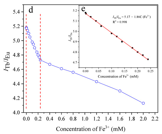 Further, for a sensitivity study, different concentrations of Fe3+ in the range of 0.002–2 mM were measured. Figure 9c shows the fluorescence spectra of the nanoscale Eu/Tb-PMA-MPEG solutions after adding various amounts of Fe3+ ions under the excitation wavelength of 360 nm. The fluorescence intensities IPMA-MPEG (the very broad peak about 390–480 nm), ITb (the peak at 544 nm) and IEu (the peak at 617 nm) all decrease with the increase in Fe3+ concentration. Increasing Fe3+ concentration leads to an obvious drop in Tb3+ emission intensity, whereas the emission intensity of Eu3+ exhibits a slow decrease. This different Fe3+-dependent emission pattern of 5D4→7F5 transition (Tb3+, ITb) and 5D0→7F2 transition (Eu3+, IEu) in the Eu/Tb-PMA-MPEG can used as a promising candidate for self-referencing sensor. As seen from Figure 9d, the change rule between ITb/IEu and the concentration of Fe3+ was clear. The plot in Figure 9e shows an adequate linear fit with a correlation coefficient (R2) of 0.998 between ITb/IEu and the concentration of Fe3+ in the concentration range of 0–0.24 mM, and the linear equation is ITb/IEu = 5.17–1.86C (Fe3+). The limit of detection (LOD) was found to be 0.46 μM, a lower value compared with that previously reported in the literature [47,48]. Figure S5 presents the CIE chromaticity of the Eu/Tb-PMA-MPEG solutions after adding various amounts of Fe3+ ions under the excitation wavelength of 360 nm. The quenching mechanism could be explained as the interaction between Fe3+ and the PMA-MPEG1.4 ligand reduces the energy transfer efficiency from PMA-MPEG1.4 ligands to Eu3+ and Tb3+ ions, especially Tb3+ ions in Eu/Tb-PMA-MPEG, as seen in Figure 9c, and this effect increases with the addition of Fe3+; thus, the luminescence of the nanomaterial is quickly reduced.