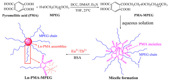 Pyromellitic acid (PMA, 98%, Sigma, St. Louis, MO, USA). Methoxypoly(ethylene glycol) (MPEG, Sigma, St. Louis, MO, USA) of Mn = 1000 g/mol was used after drying under vacuum at 90 °C for 24 h. 4-(Dimethylamino) pyridine (DMAP, 99%) and 1,3-dicyclohexyl carbodiimide (DCC, 99%) were purchased from Aladdin Reagent Co., Ltd., Shanghai, China. Eu(NO3)3⋅6H2O, Tb(NO3)3⋅6H2O and bovine serum albumin (BSA) used for material preparation were reagent grade and used without further purification. Triethylamine and THF (Sinopharm Chemical Reagent Co., Ltd., Shanghai, China) were treated with CaH2 for four days and distilled just before use. All other chemicals were of analytical grade and used without further purification. The water used was Milli-Q ultrapure water (Millipore, Billerica, MA, USA).