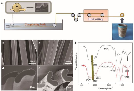 The preparation process is described in Figure 1a. In short, the spinning dopes were extruded through a spinneret, and the outer surface was solidified and rapidly formed a shell in a coagulation bath. As the moisture in the fibrous gel decreased, the formed shell collapsed under gravity. As solidification progressed, primary fibers were obtained []. In order to produce the fibers on a large scale and meet the need for commercialization, hot stretching was conducted, and the orientation of the molecular chain and the crystallization of the fibers were improved by hot stretching and hot setting (Figure S1). Figure 1b shows the SEM images of PVA and PVA/75CD fibers after the hot process. The pea-shaped cross-section fibers obtained are typical fabric fibers due to fast solidification.