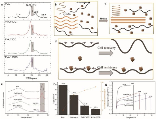 (a) XRD results of PVA, PVA/50CD, PVA/75CD and PVA/100CD fibers; illustration of the structure of (b) PVA/CD fibers before hot stretching, (c) after hot stretching and (d) coil resistance behavior; (e) DSC results of PVA, PVA/50CD, PVA/75CD and PVA/100CD fibers; (f) crystallinity ratio of PVA, PVA/50CD, PVA/75CD and PVA/100CD fibers; (g) mechanical properties of PVA, PVA/50CD, PVA/75CD and PVA/100CD fibers.