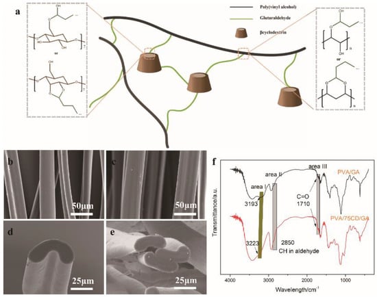 (a) Schematic illustration of PVA/CD fibers crosslinked with GA; (b) SEM images of PVA/GA fibers; (c) SEM images of PVA/75CD fibers; (d) cross-section SEM images of PVA/GA fibers; (e) cross-section SEM images of PVA/75CD/GA fibers; FTIR of PVA/GA and PVA/75CD/GA fibers; (f) FTIR spectra of acetylated fibers.