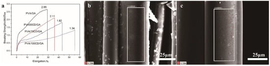 Mechanical tests of formalized PVA/CD/GA fibers were also conducted to evaluate the effect of the crosslinking effect (Figure 4a). The stress at break was enhanced compared with the PVA/CD fibers, and the elongation at break decreased after crosslinking. This can be explained by the crosslinking effect that can strengthen the PVA network, but the crosslinking points can cause stress concentration, thus decreasing the elongation at break. The mechanical strength of the PVA/CD/GA fibers is 1.34–2.11 cN/dTex, compared with the mechanical strength of regenerated bacterial cellulose fibers within the range of 0.5~1.5cN/dTex, indicating the good mechanical property of the PVA/CD/GA fibers, and the potential in the fabrication of fabrics.