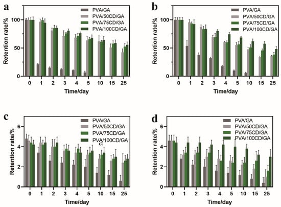 From Figure 5a,b, the control fibers PVA/GA show a fast release of fragrance, which ended at 5 days and 10 days, respectively, indicating that the crosslinked PVA fiber shows little fragrance retention property. For PVA/CD/GA fibers, the crosslinked fibers include crosslinked PVA and crosslinked β-CD. Because the crosslinked PVA matrix shows little fragrance retention property, the sustained release property should be mainly attributed to crosslinked β-CD. With the additional amount of β-CD increased, the retention rate increased. This can be explained by the host-guest inclusion ability of β-CD to encapsulate and stabilize the fragrance molecules in its hydrophobic cavity.