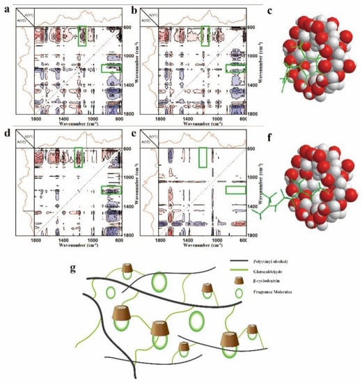 The interactions of β-CD and fragrance molecules were confirmed by 2D FTIR, which has been proved a powerful tool for studying the host-guest inclusion in many systems. Figure 6 and Figure S2 show the 2D FTIR results of the PVA/75CD/GA fibers with cis-jasmone/citronella host-guest inclusion complex and their simple blends. Figure S3 shows 1D-ATR-FTIR spectra of the PVA/75CD/GA fibers with cis-jasmone/citronella host-guest inclusion complex and their simple blends. From Figure 6a, we can see the typical peaks of β-CD (755 and 705 cm−1) and cis-jasmone (1150 cm−1, interconversion of ketone and enol) showed a correlation peak, indicating that the five-membered ring was included in the cavity of β-CD (Figure 6c). Interestingly, there is no typical correlation peak available in the blend sample. From Figure 6d, the typical peak of β-CD (755 and 705 cm−1, -OH) and citronella (1190 cm−1, -CO) also showed a correlation peak (Figure 6f), however, a similar correlation peak also cannot be found in CD and the citronella blend (Figure 6e). According to the theory for 2D IR spectroscopy developed by Noda [], a correlation peak is generated when two dipole transition moments associated with molecular vibrations of different functional groups are reorienting simultaneously. Such cooperative motion of the local structure is expected when strong interactions exist among different groups. These results indicated that the strong interaction between β-CD and citronella is because of the formation of host-guest inclusion complexes. Thus, we can conclude that the fragrance molecules in the fibers are divided into two parts: one in the cavity of β-CD and the other in the crosslinked structure. Fragrance molecules in the crosslinked structure release fast for its porous structure and the molecules trapped in β-CD release at a low rate.