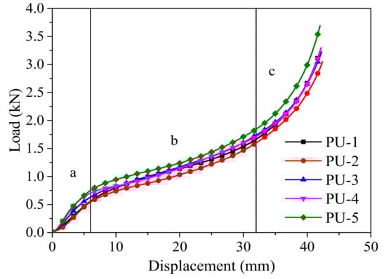 The load–displacement comparison curves of unfilled and polyurethane foam-filled bamboo composite tubes are shown in Figure 5. The load–displacement curves can be divided into three stages: linear elastic growth, elastoplastic strengthening and destruction. In the linear elastic growth stage, the load increases rapidly without any phenomena. After that, it enters the stage of elastic-plastic strengthening, and microcracks with short lengths and shallow depths gradually form. With the development of cracks, the load gradually reaches the peak value, and the bamboo fiber is broken. The load jumps to the stage of low-level load, and the curve enters a new stable state.