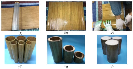 In order to overcome the shortcomings of the original bamboo tube, such as irregular size, limited diameter and large discrete performance, a composite bamboo tube made of hand-rolled bamboo slices is proposed in this paper. In addition, considering the good energy absorption of foam, polyurethane foam was used to fill the composite bamboo tube. The composite bamboo tube is prone to buckling when it is loaded alone. Filling it with foam can improve the structural stability of the thin-walled tube, but foam material is not suitable for loading alone, and the deformation recovery rate is high, so the two have good complementarity in performance. As shown in Figure 2, the manufacturing process of the polyurethane foam-filled bamboo composite tube is as follows: