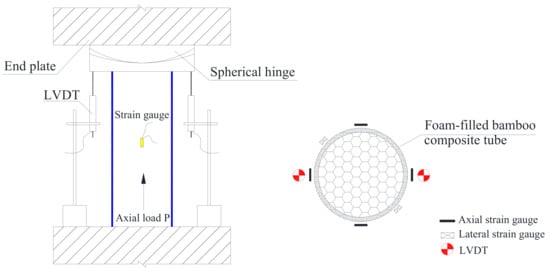 A total of 36 bamboo composite tubes with a length-to-diameter ratio (R) of 2 were prepared by using two types of tube inner diameters (D), three types of tube wall winding layers (L) and polyurethane foam filling as the parameters that changed, with a total of 12 different groups of bamboo composite tubes, each with 3 identical specimens, to eliminate random influences. The fiber orientation was parallel to the loading direction. The specific parameters of each specimen are shown in Table 3. The naming rules of the specimens are as follows: taking D100L15R2F as an example, the inner diameter is 100 mm, the number of winding layers is 15, the length–diameter ratio is 2.0, and the bamboo composite tube is filled with polyurethane foam.