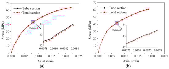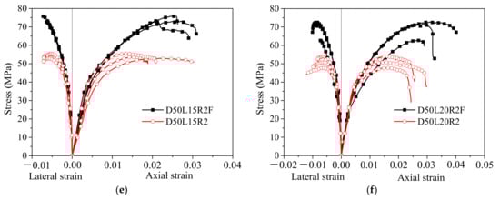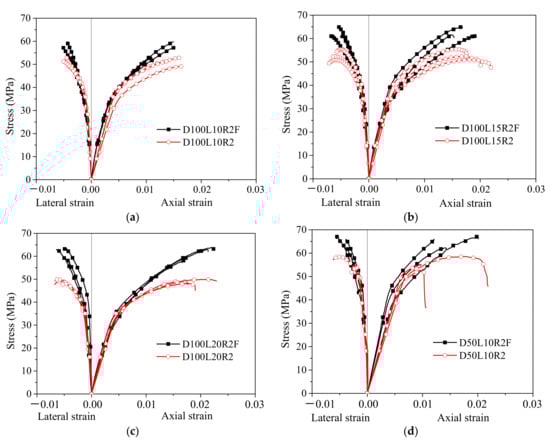 A comparison of the stress–strain curves of unfilled bamboo and polyurethane foam-filled bamboo composite tubes is shown in Figure 6. The axial strain is positive, and the lateral strain is negative in the figure. The ratio between the load recorded by the test and the actual cross-sectional area of the bamboo composite tube, which is the axial stress, was obtained without considering the cross-sectional area of the polyurethane foam. The experimental results show that the polyurethane foam was still in the linear elastic stage when the foam-filled bamboo composite tube reached the ultimate bearing state. At this stage, the maximum contribution of the axial stress of polyurethane foam was no more than 0.1 MPa. Taking the test results of D100L20R2F-1 and D100L15R2F-1 as examples in Figure 7, regardless of whether the full cross-sectional area or the cross-sectional area of the bamboo composite tube was taken into account in the calculation of axial stress, the error was only 0.07 MPa, accounting for only 0.11%. Therefore, it is reasonable to take the ratio of the load and the actual section of the bamboo composite tube as the axial stress of the specimens.