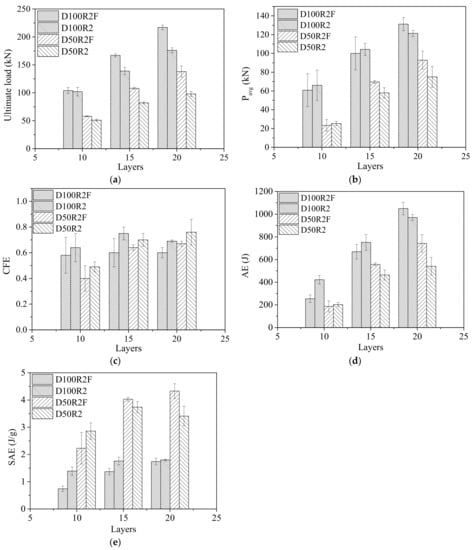 The effects of foam filler on the Pu, AE, SAE, Pavg and CFE of bamboo composite tubes are shown in Figure 8. As shown in Figure 8a, the ultimate loads of all foam-filled bamboo composite tubes were greater than those of the corresponding unfilled tubes. It is shown that the use of foam filler is beneficial to the ultimate load of bamboo composite tubes. Compared with the tubes with 10 layers, the foam filler had a more significant effect on the ultimate load for bamboo composite tubes with 15 and 20 layers. As shown in Figure 8b, the average crush load of the foam-filled tubes was not significantly different from that of the unfilled tube. Since it is the statistical data of compressive displacement to 8 mm, the change rule of absorbed energy is consistent with that of the average crush load, as shown in Figure 8b,d. For the tube with a diameter of 100 mm, the absorbed energies of the foam-filled tubes were 0.68, 0.88 and 1.08 times those of the corresponding unfilled tubes, respectively. For tubes with diameters of 50 mm, their values were 0.92, 1.20 and 1.32 times those of the corresponding unfilled tubes. The energy absorption of the polyurethane foam filler can be neglected. In terms of energy absorption, the combination effect of the foam filler and the bamboo composite tube is not excellent, which shows that the addition of the foam filler does not significantly enhance the energy absorption of the bamboo composite tube, but on the contrary, it will lead to a certain reverse effect. This effect is mainly due to the reduction in the ultimate displacement, and the foam filler does not enhance the load holding length of the bamboo composite tubes; therefore, the absorbed energy decreases instead of rising. The main reason why the load cannot be maintained is that the foam filler inhibits the inward shrinkage deformation of bamboo composite tubes, leading to the splitting failure of composite tubes after reaching the ultimate load, and the load drops rapidly. In particular, the composite tubes with fewer winding layers are more prone to splitting failure, and the foam filler has a greater negative impact on its energy absorption. Thus, the absorbed energies of most L10F and L15F specimens were smaller than those of specimens L10 and L15. As shown in Figure 8c, with the existence of foam filler, the crush force efficiency was markedly reduced because the use of foam filler increased the ultimate load, but the average crush load had no obvious enhancement trend; in contrast, there was a reduction, resulting in a smaller crush force efficiency ratio. In Figure 8e, it can be seen that the specific absorbed energy of the tubes decreases with increasing tube length. Therefore, reducing the height of the bamboo composite tubes and increasing the number of winding layers of the bamboo composite tubes can effectively increase the positive effect of the foam filler on energy absorption.