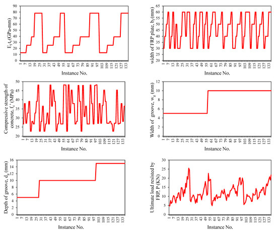 Figure 2 illustrates the magnitude of the input and target variables used in the study. The input variables were the elastic modulus of FRP times the thickness of fiber (Eftf, GPa-mm), which is also termed as axial stiffness, the width of the FRP plate (bf, mm), the concrete compressive strength (fc′, MPa), the width of the groove (bg, mm), and the depth of the groove (hg, mm), whereas the ultimate capacity (P, kN) was considered a target variable. The database comprised 133 experimental results of single-lap shear tests (SSTs) taken from the previous study [47], which was reported by [43]. The data were evenly distributed between the extremes. Eftf ranged between 12.90 to 78.90 with a skewness of 0.58. The database used in our study was experimentally conducted by Moghaddas, et al. [47]. Four different widths of FRP sheets (bf as shown in Figure 1b), equalling 30, 40, 50, and 60 mm were used in the investigation. Four variable groove sizes (5 × 5, 5 × 10, 10 × 10, and 10 × 15) were considered. Three different mix designs with concrete strengths of 25, 35, or 45 MPa were used to manifest change in the strength of concrete. The SST tests were conducted on FRP plates bonded on one side with a concrete cylinder (150 × 150 × 350 mm), as shown in Figure 1b. It is worth mentioning that the FRP surface roughness may affect IBS; however, this study was based on experimental tests conducted on FRP sheets made of the Sika wrap-200C, Sika wrap-300C, and Sika wrap-430G types of carbon and glass fibers bonded with epoxy Sikadur 330 adhesive material, as reported in Moghaddas, et al. [47]. Other statistics of the employed database are listed in Table 1.