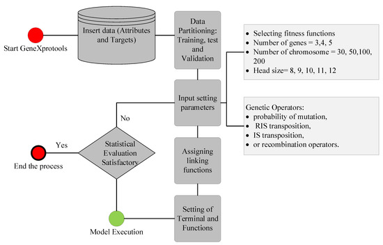 The GEP model, based on Darwinian principles, was inspired by the recombination of genetic materials in living organisms. An AI-based GEP model is a type of evolutionary algorithm that comprises complex trees called expression trees (ETs). The shape and size of these ETs was adjusted with the learning of the GEP model. The modelling of the GEP was carried out using GeneXproTools Version 5. Initially, the data comprising 133 data points were fed into the modelling environment. The variables were assigned as inputs and target variables. The data was partitioned into 70% training and 30% validation data using random partitioning. Subsequently, the setting parameters were varied in order to yield a high-performance model. The fitness function was selected as RMSE; the number of genes, chromosomes, and head size was varied. In addition, genetic parameters such as the probability of mutation, RIS transposition, IS transposition, or recombination operators were set according to the previous literature [38]. The linking functions within ETs were assigned as +, −, /, sqrt, and x2, whereas the linking function between ETs was assigned as an addition (+). The model was executed and allowed to train until the best fitness was achieved. The authors use the term “best fitness” to mean that the model was allowed to train until no further enhancement in the performance in terms of correlations and error indices was observed. At the same time, the performance of the validation data was also monitored in order to avoid over-fitness of the model. The model was stopped to generate mathematical equations upon achieving the best performance. The schematics of the GEP modelling are shown in Figure 3.