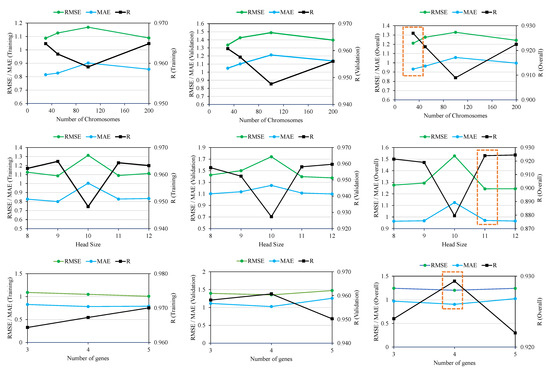 Effect of variable genetic parameters on the performance of the models (orange boxes show the optimized overall performance based on number of chromosomes, head size and genes).