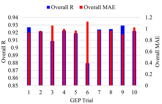 Figure 4 depicts the variation of genetic parameters and the corresponding change in the value of R, MAE, and RMSE. Although the performance of the models varied in the training and validation stages, the best model was selected on the basis of overall values of R, MAE, and RMSE, achieved by averaging the performance of the results of training and validation data. Initially, the number of chromosomes was varied in the order of 30, 50, 100, and 200, with constant number of genes and head size equalling 3 and 8, respectively. The values of R decreased by changing chromosomes from 30 to 50 from 0.965 to 0.962 for the training data, whereas for the validation data, R was reduced from 0.961 to 0.958 as shown in Table 2. The values of MAE and RMSE also increased with the change in number of chromosomes from 30 to 50. Further increases in chromosomes from 50 to 100 and 200 did not improve the performance of the models. The overall best performance of the models for 4 variable numbers of chromosomes was attained at a magnitude of 30. Therefore, in onward trials, chromosomes were retained at 30, and the head size was changed from 8 to 9, 10, 11, and 12. The performance of the models increased by changing head size from 8 to 9 and then decreased at 10, whereas the most optimized results were obtained at a head size of 11. This way, two parameters, i.e., number of chromosomes and head size, were optimized at 30 and 11, respectively, as tuning parameters for the next trials to be executed with a variable number of genes. It has been observed that an increase in the number of genes complexifies the output equation and the performance of the model; however, an increasing number of genes beyond five complexifies the output equation to a greater extent [38]. Figure 4 shows that four genes yielded the optimized performance of the models. In this study, 30 chromosomes, 11 head size, and 4 number of genes yielded the best performance. Previously, it has been evaluated that the optimized performance was achieved at different setting parameters [52] for different types of problems. Since it was concluded that the setting parameters generally depend on the trial and access methods in the GEP modelling, they must therefore be determined on the basis of rigorous exercise by varying the genetic parameters. Figure 5 shows that the best trial observed was trial number 9, for which the magnitude of overall R and MAE were recorded as 0.964 and 0.9045.