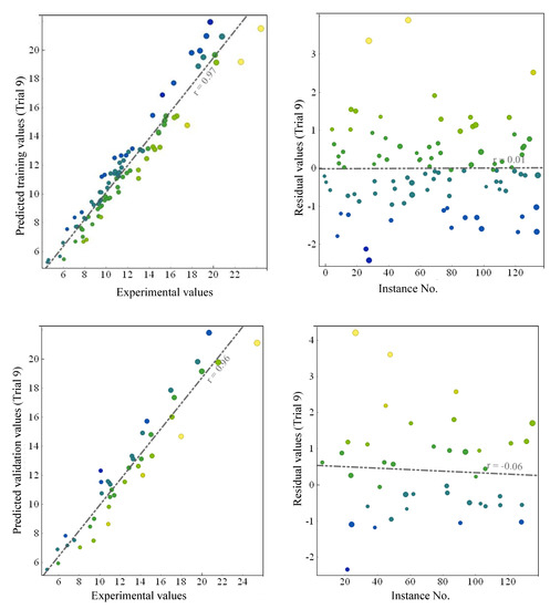 The regression slope of the line trending from plotting experimental results on the X-axis and predicted results on the Y-axis was investigated in this section regarding the performance of the developed models (Figure 6). A similar type of analysis in evaluating AI models has been previously practised by numerous researchers [36,37,38]. While exploring the non-linear capabilities of ANN for the compressive strength of polyethylene-terephthalate-incorporated cementitious grouts, Khan, et al. [36], found this slope equal to 1.01 and 0.90 for the training and testing data, respectively. A value of this slope more significant than 0.80 indicated agreement between the experimental and predicted results reported in the previous studies [39,51]. From Figure 6, it can be observed that the slopes for the training and validation data for trial 9 were 0.99 and 0.96, respectively. The values of the regression slopes were more significant than 0.8; therefore, the models reflected a good correlation between experimental and predicted results. Error analysis showed that the training and validation data trend line almost passed through 0 residual value. In addition, most of the residual points (experimental-predicted) lie between 1 and −1 kN.