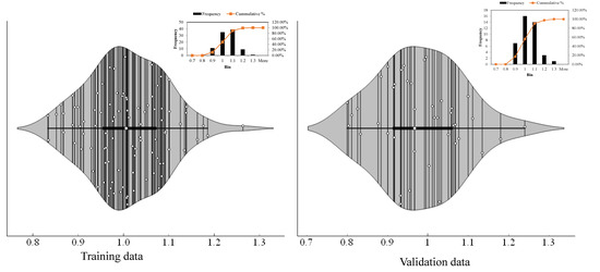 As discussed in Section 3.1 and Section 3.2.1, the model obtained in trial 9 was the most accurate model among the various trials investigated herein. Therefore, the results of trial 9 are plotted in the form of predicted/experimental values to manifest the accuracy in more detail. Feng, et al. [53], evaluated this ratio within ±20% while studying the XgBoost model for predicting the shear strength of squat-reinforced concrete walls. When supplemented with other statistical evaluations, the model interpreted its accuracy as higher than other empirical models. In ourstudy, Figure 7 and Table 3 show that almost 90% of data points lie between 0.9 and 1.1, which shows that the percentage of errors in predictions obtained in trial 9 are within ±10%, thus reflecting the string robustness of the developed model. This evaluation further strengthens the model for predicting IBS of FRP laminates bonded on grooves with a concrete prism.