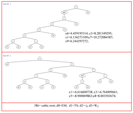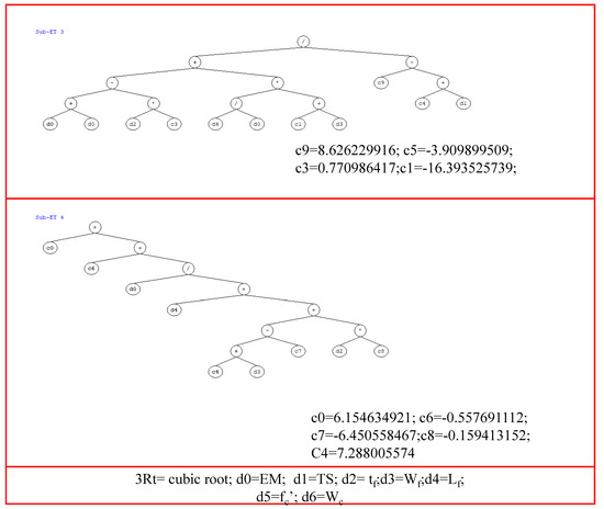 The MATLAB model obtained from the GEP analysis was employed to extract simple mathematical equations for the prediction of IBS of FRP laminates bonded on grooves to the concrete prism. Figure 8 shows the ETs extracted from the GEP model, which was used to furnish the prediction equation expressed as Equation 1. It can be observed that trial 9 was executed on 4 genes; therefore, ETs contain 4 sub-ETs. The symbols denoted as c1, c2, c3, etc., among others in each sub-ET, are constants whose values are given in Figure 8. These constants and linking functions (+, −, *, /) in each sub-ET have been used to develop the mathematical equation. The following equation expressed as Equation 1 identifies that each input parameter (Ef is elastic modulus of fiber; tf = thickness of fiber; bf = width of fiber plate; fc′ is concrete compressive strength; bg = width of groove; hg is depth of groove) shall be used to predict the value of IBS.