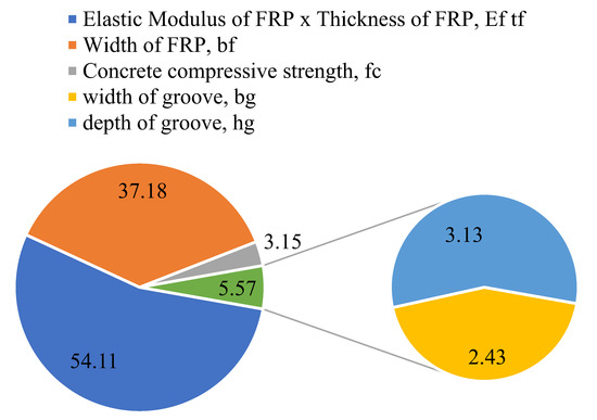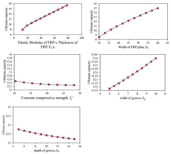 From the Figure 9, It was observed that axial stiffness, which is termed as Eftf herein, had considerable influence in yielding IBS. It contributed more than 50% of the bond strength to the FRP laminates, followed by the width of FRP laminates (bf), which contributed 37.18%. The other factors, i.e., concrete compressive strength and the width and depth of the groove, contributed 8.72 altogether. This reflects that the adhesion of the FRP laminates with the groove did not considerably increase the bond strength of FRP laminates in yielding IBS. The parametric analysis in Figure 10 shows that the ultimate bond capacity linearly increased with a rise in the axial stiffness and width of the FRP laminate. The other parameters depicted no considerable change. It is important to mention that a continuous increase in these parameters would not raise the ultimate bearing capacity; however, the parametric analysis (Figure 10) was conducted to verify that the model had been trained reliably. For optimum magnitude of these parameters, a detailed study is needed based on a wide range of experiments.