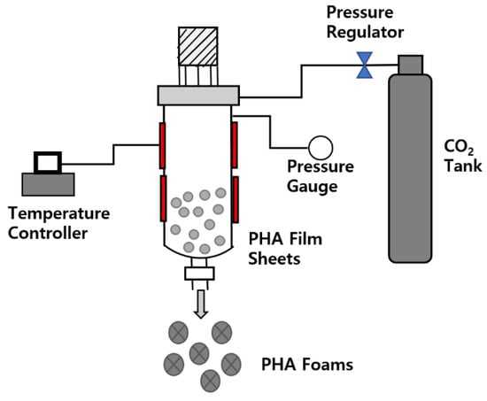 The P(3HB-co-4HB) foam beads were prepared by adding 10 g of beads to a lab-made autoclave, as shown in Figure 2, diffusing supercritical CO2 into P(3HB-co-4HB) for 60 min at the supercritical condition of CO2 of 50–135 °C and 70–100 bar, then releasing the pressure abruptly to atmospheric pressure.