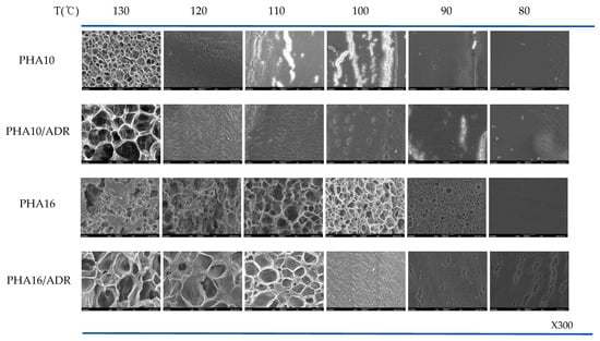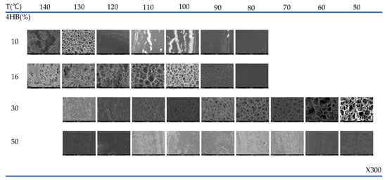 The SEM micrographs that show the possibilities of cell formation in the foams prepared in the range 50–130 °C at 90 bar for different 4HB contents are shown in Figure 3. As can be observed, the temperature at which the cells develop depends on the 4HB content. In the case of P(3HB-co-10% 4HB), whose relative crystallinity is highest, (23.97 J/g) as shown in Table 1, cell structure develops when processed at 130 °C, while in the case of P(3HB-co-16% 4HB), whose relatively crystallinity is lower (3.99 J/g), cell structure develops when processed at 100–110 °C. P(3HB-co-30% 4HB) is non-crystalline and the cell structure develops at a lower foaming temperature of 50–80 °C, but cell structure does not develop in the case of P(3HB-co-50% 4HB) in the range studied.