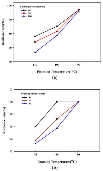 The cell structure of P(3HB-co-4HB) foams shown in Figure 3 generally shows thinner cell walls, which hinder the formation of closed cells and result in an open cell structure compared with thermoplastic polyurethane (TPU) foam [39], which is highly elastic, and the cell size is also very irregular. However, the non-crystalline P(3HB-co-30% 4HB) foam exhibits thicker walls and more regular size in the closed cell, compared with crystalline P(3HB-co-4HB). This can be explained by the crystallinity and their morphology affecting the foaming temperature. In crystalline P(3HB-co-4HB), the chain flexibility to foam the cell can be obtained just under the melting temperature, and then the strength for cell nucleation and growth is rapidly lowered with a further increase in temperature, which resulted in uncontrolled cell growth and cell coalescence. However, cell growth and stabilization in non-crystalline P(3HB-co-4HB) are more stable because the forming could be archived in a broad range of temperatures with high elastic properties above the glass transition temperature. The cell structure is related to the resiliency against applied pressure. Figure 5 shows the resilience rate of the crystalline P(3HB-co-10% 4HB) foam and noncrystalline P(3HB-co-30% 4HB) foam. The resilience of P(3HB-co-30% 4HB), which is noncrystalline due to the high 4HB content, is greater than that of crystalline P(3HB-co-10% 4HB). This is due to the higher elasticity of P(3HB-co-30% 4HB) from its higher 4HB content and also due to the thicker cell walls and more regular cell structure. The resilience rate of P(3HB-co-30% 4HB) foamed at different temperatures, as shown in Figure 5b and showed much higher resilience for foams prepared at lower temperatures. This shows that the elastic properties of P(3HB-co-30% 4HB), along with open/close cell structure, the thickness of the cell walls, and cell size, which in turn depends on an expansion ratio, has a close relationship with resiliency. These results suggest that the possibility of using crystalline P(3HB-co-4HB) foams as an environmentally friendly packaging material is higher than that of using it for industrial structural material, which requires elasticity and resiliency to recover to its original form after compression, as it has an open cell structure compared with TPU foams. On the other hand, the non-crystalline P(3HB-co-30% 4HB) foams prepared at low temperatures with 100% resilience rates suggest the possibility of developing it as an industrial structural material.