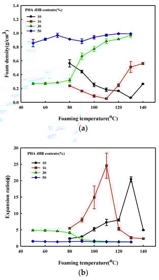 Figure 6 shows the effect of foaming temperature on the density and the expansion rates calculated from density measurements before and after the expansion of P(3HB-co-4HB) beads of different 4HB content. The different foaming characteristic of P(3HB-co-30% 4HB) of different 4HB content was confirmed by the SEM micrographs in Figure 3. P(3HB-co-50% 4HB) with the highest 4HB content does not show a significant change in density over the range studied, suggesting that cell growth from the diffused supercritical CO2 is not possible, due to its high tan δ value. The growth of cells in P(3HB-co-30% 4HB) at the foaming temperatures of 50–80 °C due to adequate tan δ and chain mobility can be confirmed. The cell growth of crystalline P(3HB-co-10% 4HB) and P(3HB-co-16% 4HB) at low temperatures is difficult due to the crystalline structure and lack of chain mobility, but near the melting temperature, chain mobility occurs and the tan δ becomes adequate for foaming to result in cell growth. The highest expansion ratios are obtained at 130 °C and 110 °C for P(3HB-co-10% 4HB) and P(3HB-co-16% 4HB), respectively. However, the uniformity of cells is very poor, due to the rapid decrease in strength to maintain cells during the stabilization step. The expansion ratio of non-crystalline P(3HB-co-30% 4HB) is below 6, while that of crystalline P(3HB-co-10% 4HB) and P(3HB-co-16% 4HB) is over 20. These P(3HB-co-4HB) foams have different expansion ratios, suggesting that they can be used to prepare foams for different applications.