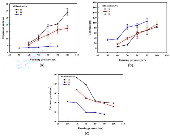 Effect of forming pressure on the structure of the P(3HB-co-4HB) foams. Foaming temperatures of P(3HB-co-10% 4HB), P(3HB-co-16% 4HB), and P(3HB-co-30% 4HB) are 130 °C, 100 °C, 50 °C, respectively; (a) expansion ratio; (b) cell size; (c) cell density.