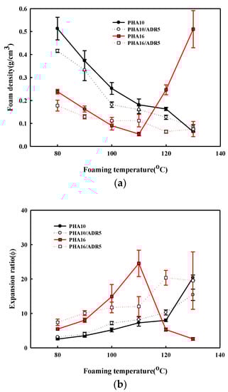 SEM micrographs that show the effect of the addition of a chain extender on the supercritical CO2 foaming are shown in Figure 9. Although the addition of a chain extender to crystalline P(3HB-co-10% 4HB) increases cell size when foamed at 130 °C, it does not affect the temperature window where foaming is possible, while in the case of P(3HB-co-16% 4HB), the temperature window appears at a higher temperature and is broadened from 110–100 °C to 120–130 °C. Figure 8b shows that although foaming of non-crystalline P(3HB-co-30% 4HB) is possible in the temperature range 50–90 °C in the absence of a chain extender, it is not when a chain extender is added. It was found that the degree of crystallinity of P(3HB-co-4HB) modified by a chain extender decreased dramatically, as shown in Table 1. This indicated that the crystalline structural change and the chain flexibility took place by chemical modification. As a result, the tan δ decreases observed in Figure 4 are caused by a structural change in the formation of chain branching or crosslinking from the reaction of epoxy groups of the chain extender Joncryl ADR 4370, containing epoxy groups, and the 3HB hydroxy groups in the crystalline P(3HB-co-4HB) of low 4HB content, resulting in a decrease in tan δ. However, in the case of P(3HB-co-4HB) of high 4HB content, viscosity decrease occurs instead of the aforementioned increase and decreases tan δ to decrease the foamability. Figure 10 shows the effect of a chain extender on the foam density and expansion ratio of the foam. The addition of the chain extender does not affect the foaming conditions in the case of P(3HB-co-10% 4HB) due to relatively high crystallinity, but a general increase in the expansion ratio with a decrease in foam density occurs. However, in the case of P(3HB-co-16% 4HB), the change in tan δ with the change in the chain structure allows foaming at temperatures above 110 °C and the foam density remains low above 110 °C to allow foaming at 120–130 °C, where foaming was not possible in the absence of a chain extender and an expansion ratio of around 20 can be obtained. Therefore, the control of the foaming properties with a chain extender is only possible in crystalline P(3HB-co-16% 4HB) with reasonably low crystallinity and tan δ value.