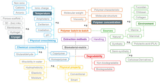 In the development of biomaterials, each variable (method, origin material, and concentration, among others) can be defined as a different parameter that, individually or grouped, influence the material characteristics, behavior, properties, and consequently, its final application. However, the interaction between different parameters is complex since it depends not only on direct variables but also on indirect multivariable, such as surrounding temperature, moisture variations, and handling procedures [12], as shown in Figure 1. In the case of cryogels, the temperature (below zero), the chosen sources, the initial polymeric concentration, and their basic structural properties (e.g., the type of ionic charge available) are crucial for forming these types of biomaterials [13]. The selection of the most relevant parameters and the values promising improved performance should be made with caution, envisaging the final application or approach. Therefore, it is crucial to prudently reflect on the parameters to be considered, and for instance, construct a schematic representation of their role and interactions that may affect the final result.
