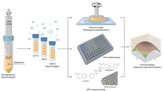 Schematic representation of the marine cryogel formation procedure comprising homogenization and freezing at different temperatures and then its characterization, aiming for a factorial design to extrapolate the optimum marine cryogel formulation according to the obtained results from rheology, anti-oxidants activity, and ATP measurements.
