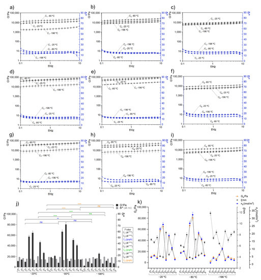 The rheological oscillatory experiments in distinct marine cryogel compositions were performed to understand their mechanical properties. This analysis consisted of measuring the elasticity modulus (G′), the viscosity modulus (G″), and the phase angle (δ/°) obtained from G″/G′ (or damping factor, tan δ) to evaluate the resistance to shear stress within a frequency range and performed at 25 °C. The obtained results and the respective statistical analysis are shown in Figure 3, with G′ and δ being barely independent of frequency (between 0.1 and 10 Hz) for all the analyzed cryogels. Moreover, the composition of the cryogels influenced the rheological behavior, as illustrated by the variability of G′ shown in Figure 3j).