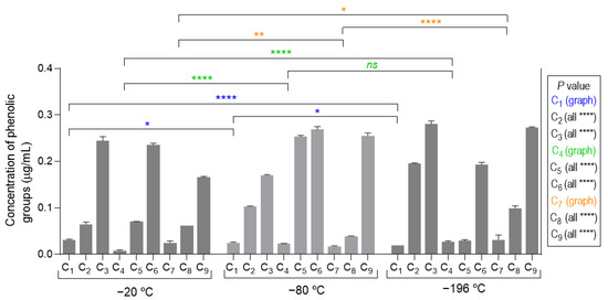 Assessment of antioxidant activity of marine origin cryogels (C1 to C9, produced at −20, −80, and −196 °C) by the quantification of phenolic groups. All samples (comparing the different temperatures) showed statistical significance of **** p < 0.0001 except those represented with the symbols of * (p < 0.05), ** (p < 0.01), and ns (not significant).