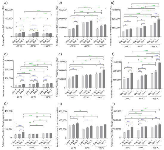 ATP cell measurements using ATDC5 cells in direct contact with all developed marine cryogels C1 to C9 ((a–i), respectively) at −20, −80, and −196 °C. There was a direct relationship between the measured phosphorescence and the concentration of ATP. The samples showed statistical significance of * (p < 0.05), ** (p < 0.01), *** (p < 0.001), **** p < 0.0001, or were not significant (not represented). The symbols of statistical analysis noticeable by blue color correspond to the comparison between each condition in relation to the time points while the symbols expressed by green color represent the comparison between the different temperatures of each marine condition.