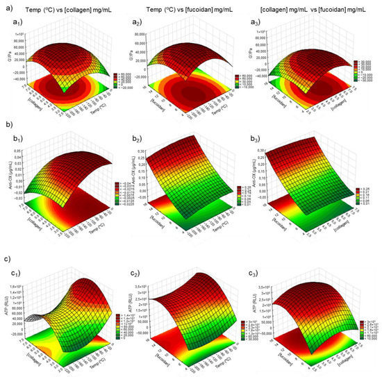 Factorial surface response of (a) rheological data (G′/Pa), (b) antioxidant activity (µg/mL), and (c) ATP (RLU) measurements on marine origin cryogels. The images of (a1, b1, and c1) demonstrate the correlation between the temperature (°C) vs. concentration of collagen ([collagen]); (a2, b2, and c2) represent the correlation between the temperature in relation to the concentration of fucoidan ([fucoidan]) while the images of (a3, b3, and c3) show the correlation between the concentration of collagen vs. the concentration of fucoidan.