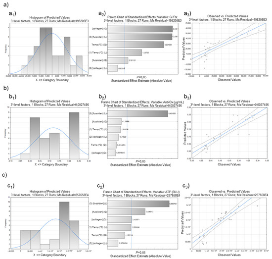 Factorial response of (a) rheological data (G′/Pa), (b) antioxidant activity (µg/mL), and (c) ATP (RLU) measurements on marine origin cryogels. The images (a1, b1, and c1) demonstrate the histogram of distribution; (a2, b2, and c2) represent the Pareto charts of standardized effects of the factorial design, while the images of (a3, b3, and c3) show the Box–Behnken design plot for predicted versus actual values for each response variable.