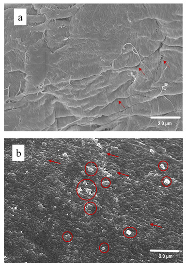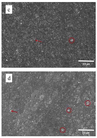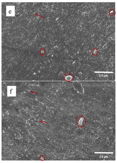 Figure 4b sheds light on the fact that the BF sample has a squamous structure on its surface with few irregular pores, protrusions and cracks. These pores can be ascribed as typical characteristics of the regenerated cellulose fibers [46,47] and provide the fibers with good air permeability. It is obvious that the smoothness is significantly improved after the addition of urea. By contrast, the UF sample (Figure 4c) exhibits fewer protrusions and cracks, and has a smaller pore size with a uniform distribution on its surface. Accordingly, after adding urea into the dissolution system, the occurrence of structure evolution can be found in the regenerated fibers, and thereby the related optimal distribution of urea in the coagulation bath can also be obtained.