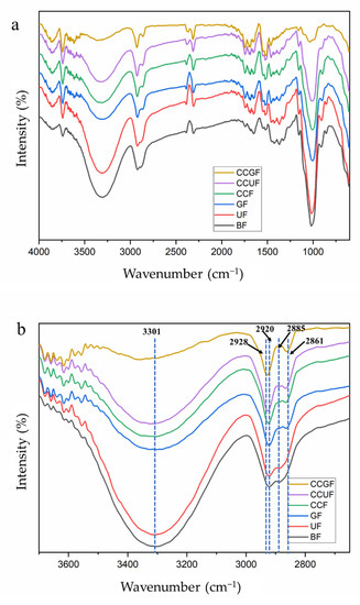 Figure 5d illustrates the FT-IR spectra with a wavenumber between 1200~650 cm−1. The band at 1019 and 913 cm−1 in the BF sample are shifted to 985 and 897 cm−1 in the samples with additives. These changes are related to the transformation of intra- and intermolecular bonds [28], which shows stronger/more hydrogen bonds together with a tight arrangement of the cellulose chains. The peak at 1650 (Figure 5a) and 700 cm−1 could be attributed to the hydrogen-bound water within the cellulose fiber, indicating that the water is not completely removed and becomes part of the hydrogen bond network within regenerated cellulose [60]. The peak at 1466 cm−1 (Figure 5c) is determined to be the characteristic bands of N-H stretching vibration. It is obvious that the peak at 799 cm−1 can be identified in GF, CCF, CCUF and CCGF samples. It is speculated that the urea and choline chloride could interact with cellulose and remain in the fiber after regeneration [55].